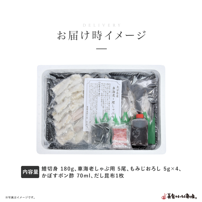 ●セット内容(冷凍)/ 鱧切身 180g、車海老しゃぶ用 5尾、もみじおろし 5g×4、かぼすポン酢 70ml、だし昆布1枚