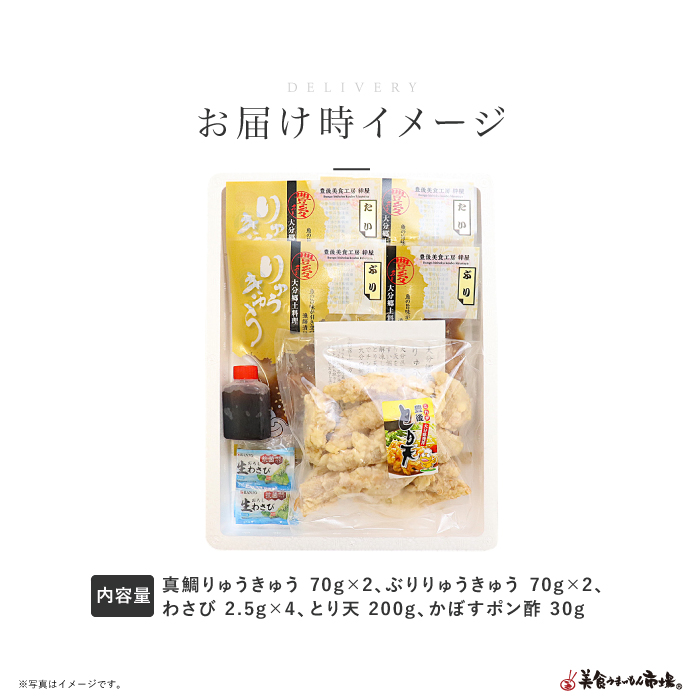 ●セット内容(冷凍)/ 真鯛りゅうきゅう 70g×2、ぶりりゅうきゅう 70g×2、わさび 2.5g×4、とり天 200g、かぼすポン酢 30g