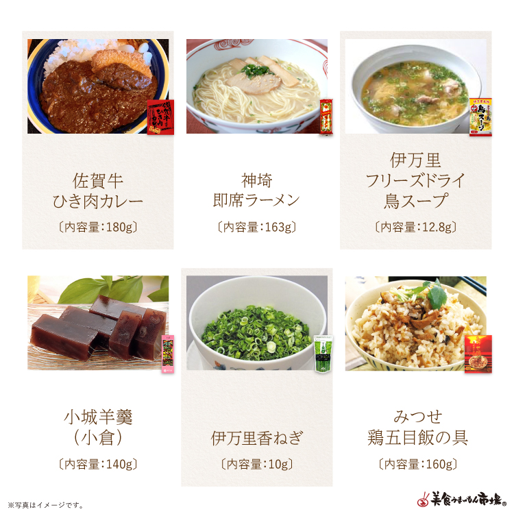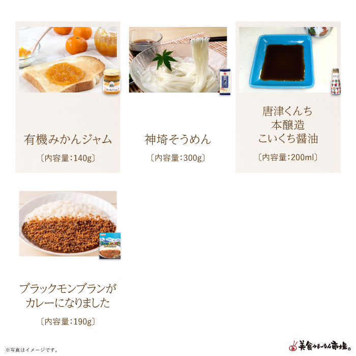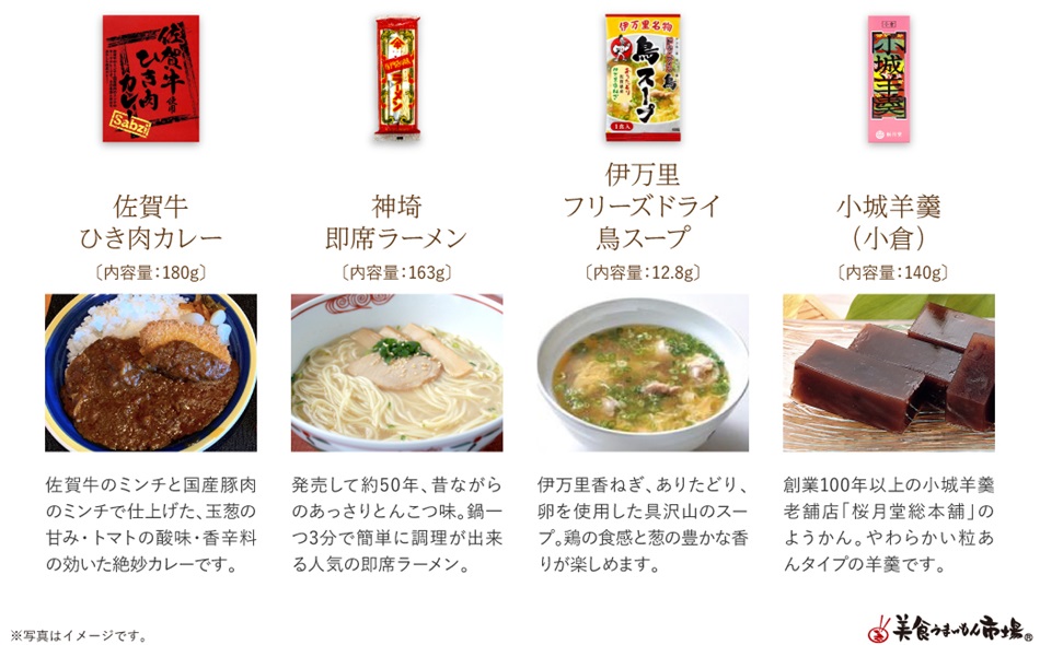 ●セット内容(常温)/ 佐賀牛ひき肉カレー、神埼即席ラーメン、伊万里フリーズドライ鳥スープ、小城羊羹(小倉)、伊万里香ねぎ、みつせ鶏五目飯の具、有機みかんジャム、神埼そうめん、唐津くんち 本醸造こいくち醤油、ブラックモンブランがカレーになりました